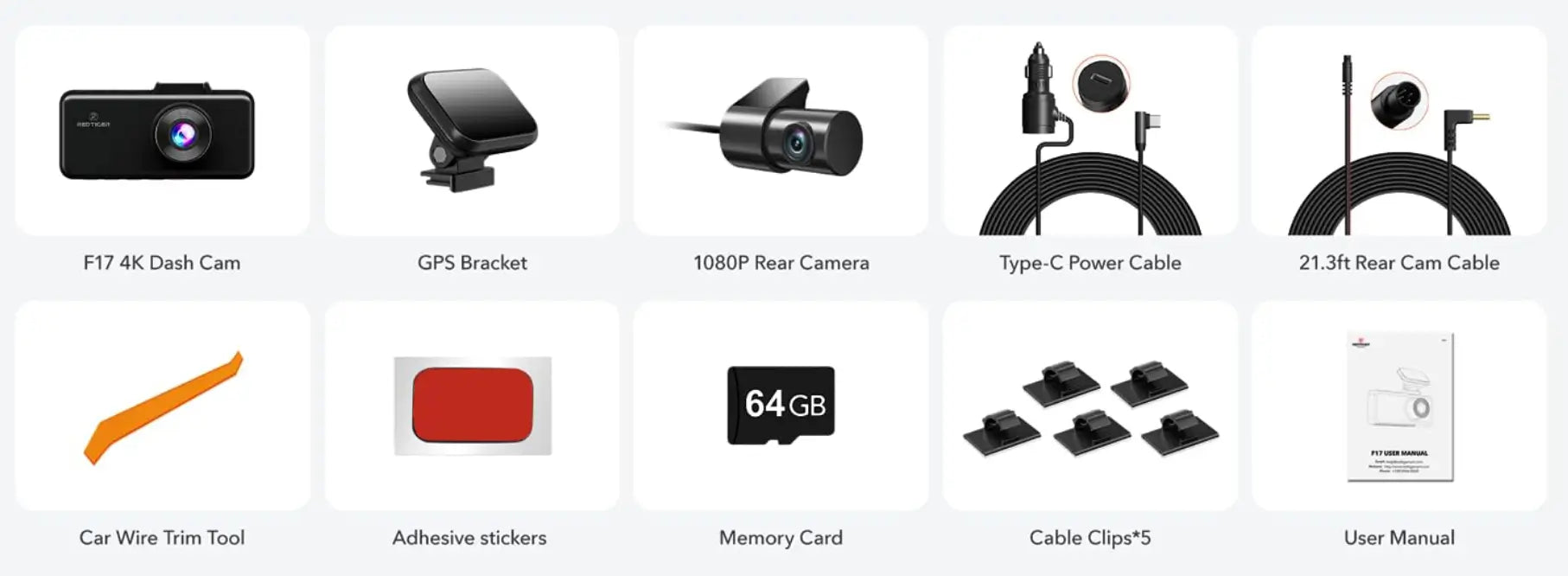 •F17 Basic: F17 Basic includes 4K front & cabin cameras, parking-monitor hardwire kit, 1080p in-car rear camera, 64 GB SD card, and 24-month warranty.