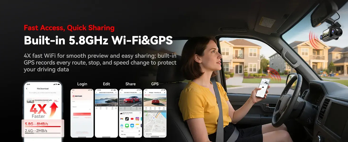 With ultra-fast 5.8GHz WiFi, you can achieve 4x speed in video transmission and real-time access via the Redtiger Cam app. You can easily preview, edit and share recordings of the four-channel dash cam. The built-in GPS accurately tracks driving speed, route and location. All video and GPS data syncs seamlessly through the app and can be accessed instantly, keeping you in complete control anywhere - Voice control and touch screen operation