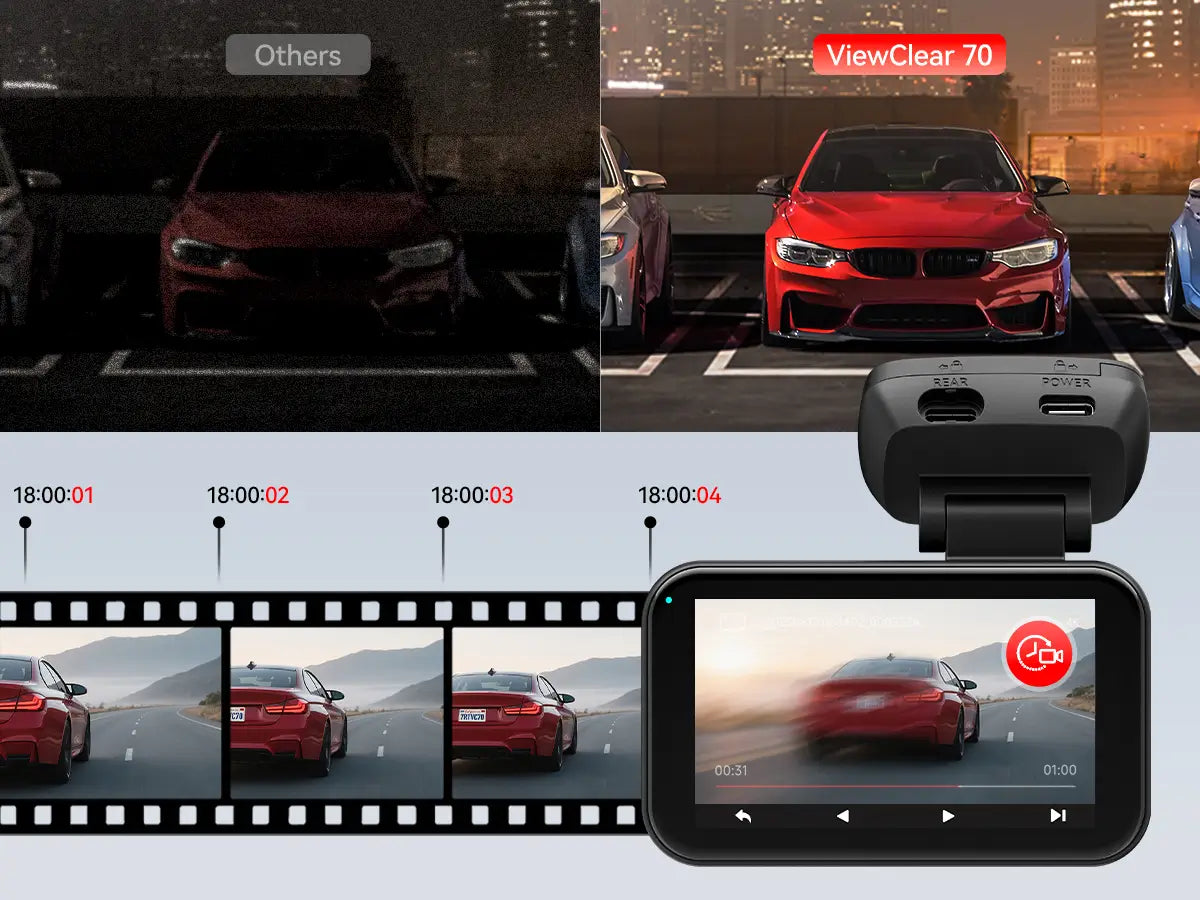ViewClear 70 uses an ultra-sensitive backlit CMOS sensor with multi-frame long exposure, advanced noise reduction, and detail enhancement algorithms. In Parking Mode, it captures and amplifies the faintest ambient light—even in pitch darkness—delivering crystal-clear, full-colour brightness video.