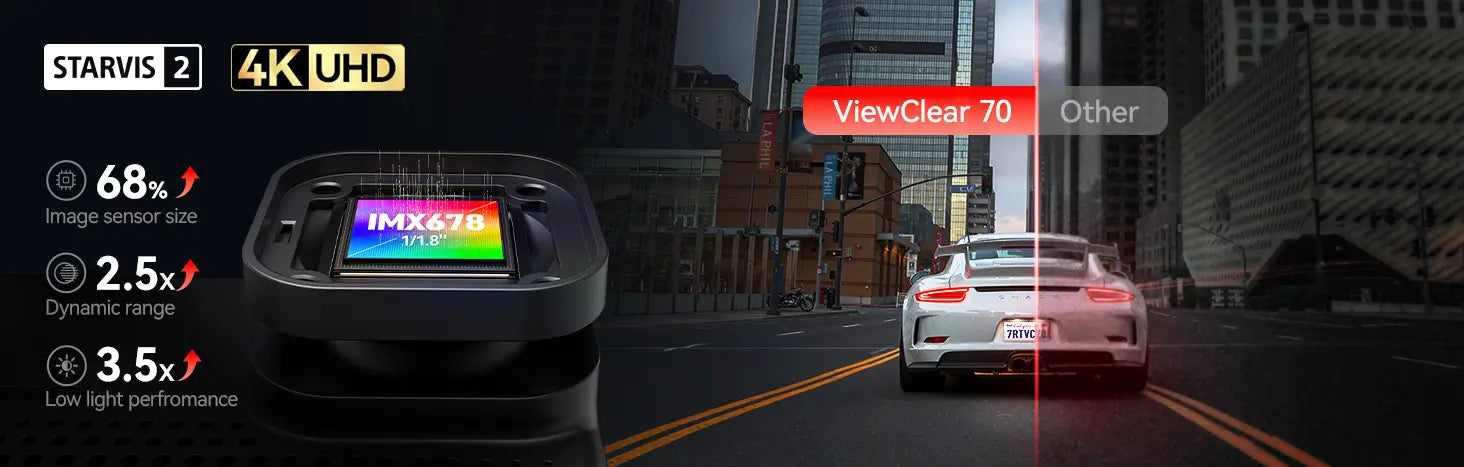 ViewClear 70’s front camera, powered by the SONY IMX 678 sensor, captures cinematic-quality video of the road ahead—even in pitch darkness—by slashing noise and motion blur for a hyper-responsive, true-to-life view.