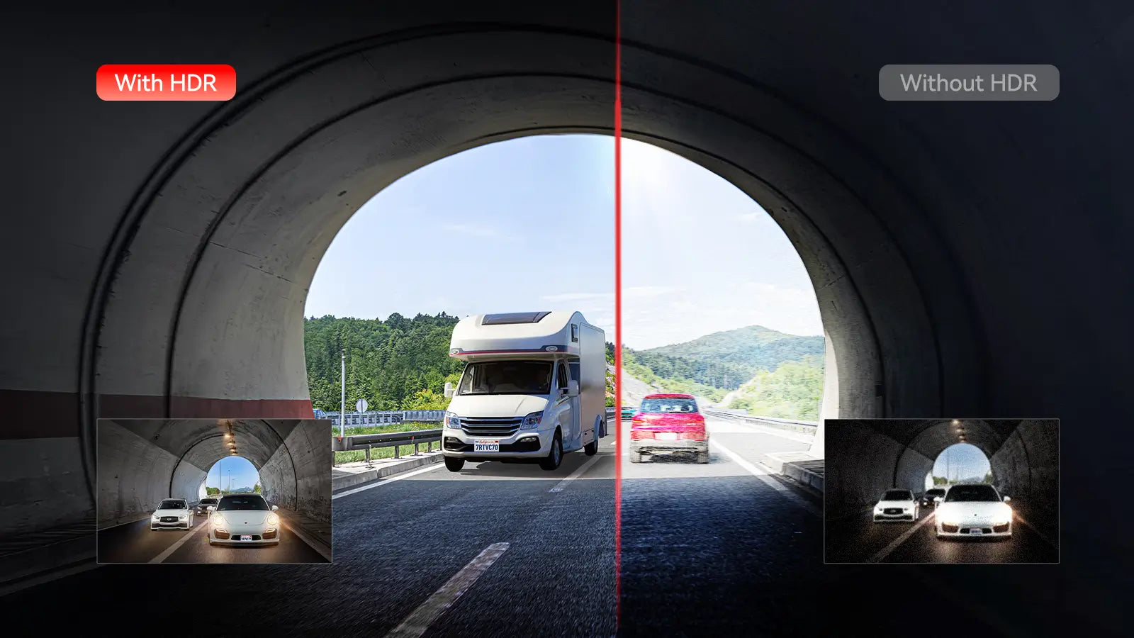 When you entering and exiting tunnels,meeting vehicles with strong lights at night,Dual HDR balances light and shadow, keep your front and rear recordings clear.