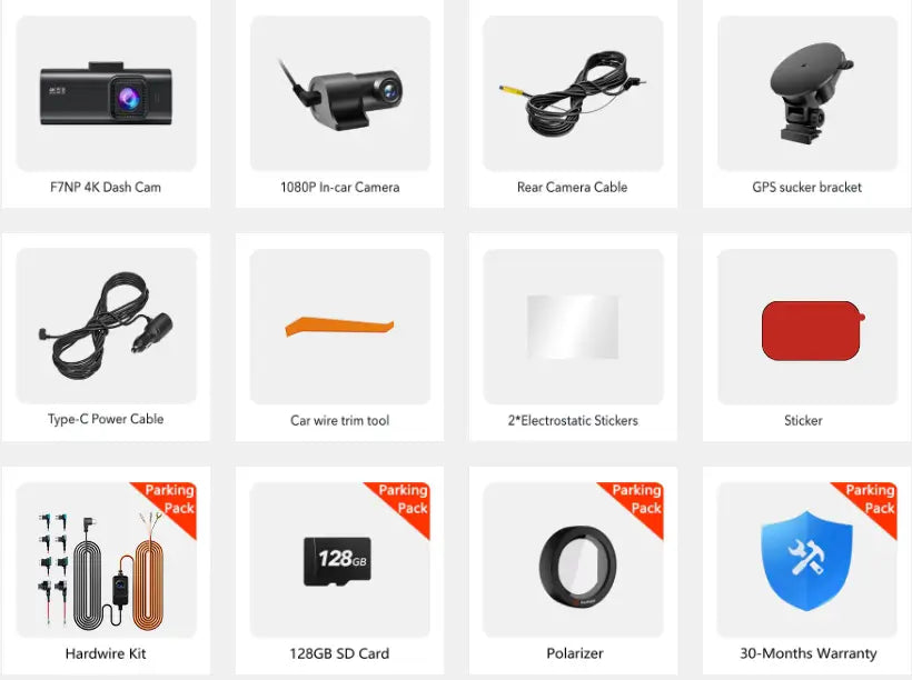 Comes with a front camera, an in-car rear camera (non-waterproof), car charger, and a 32GB SD card. - Best Value – F7N:
